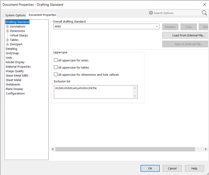 4. You can modify document parameters, such as unit information, line styles, and fonts. To do so, click on Tools > Options>Document properties.